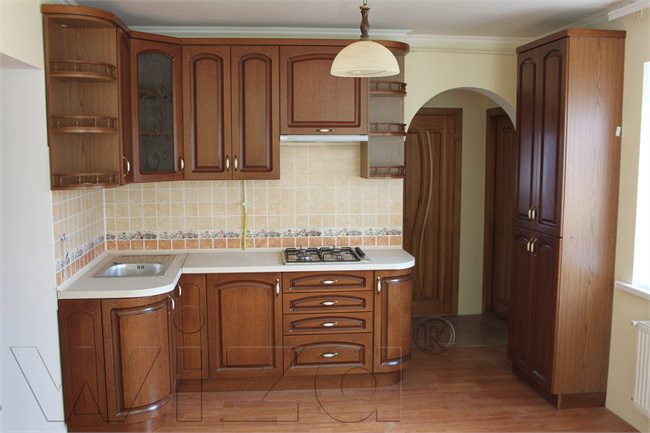 • Сочитание двух материалов:шпона и краски,делает кухню практичной и яркой.