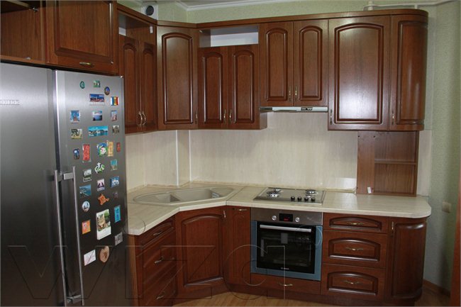• Сочитание двух материалов:шпона и краски,делает кухню практичной и яркой.