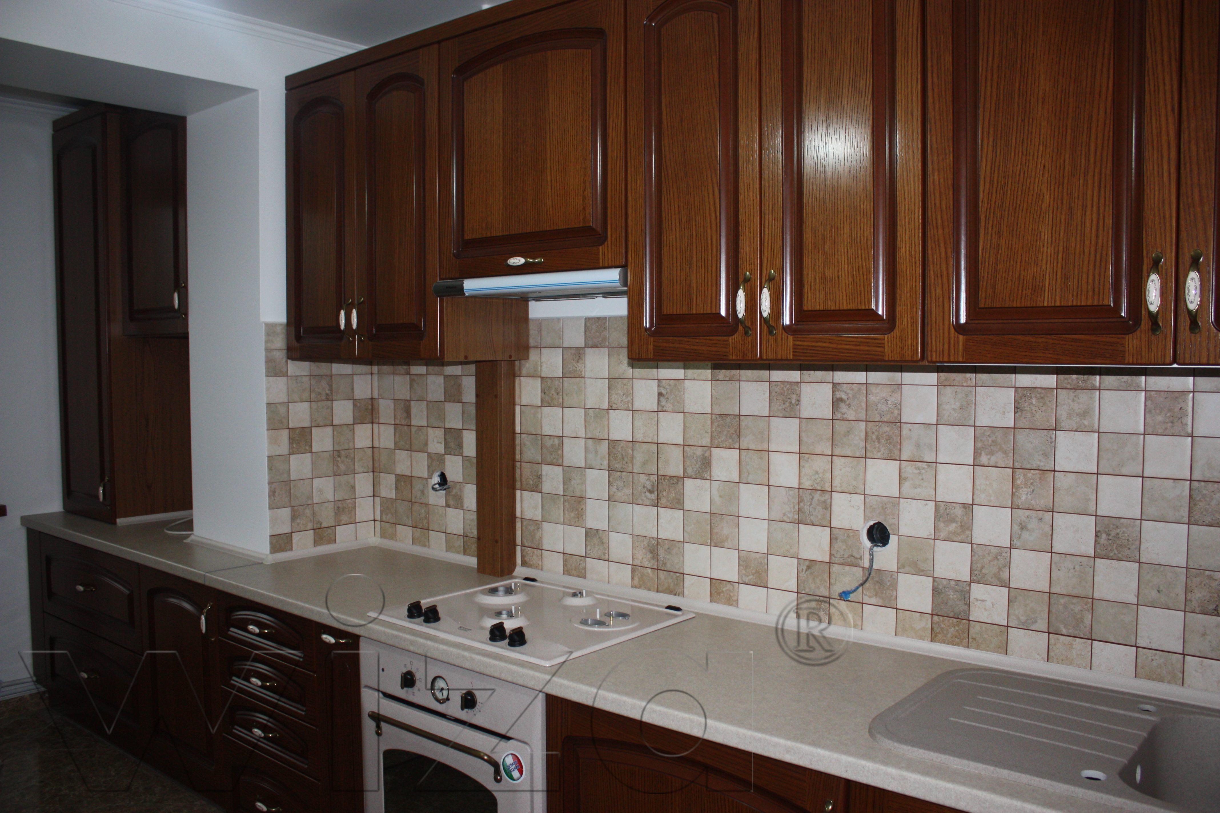 • Сочитание двух материалов:шпона и краски,делает кухню практичной и яркой.