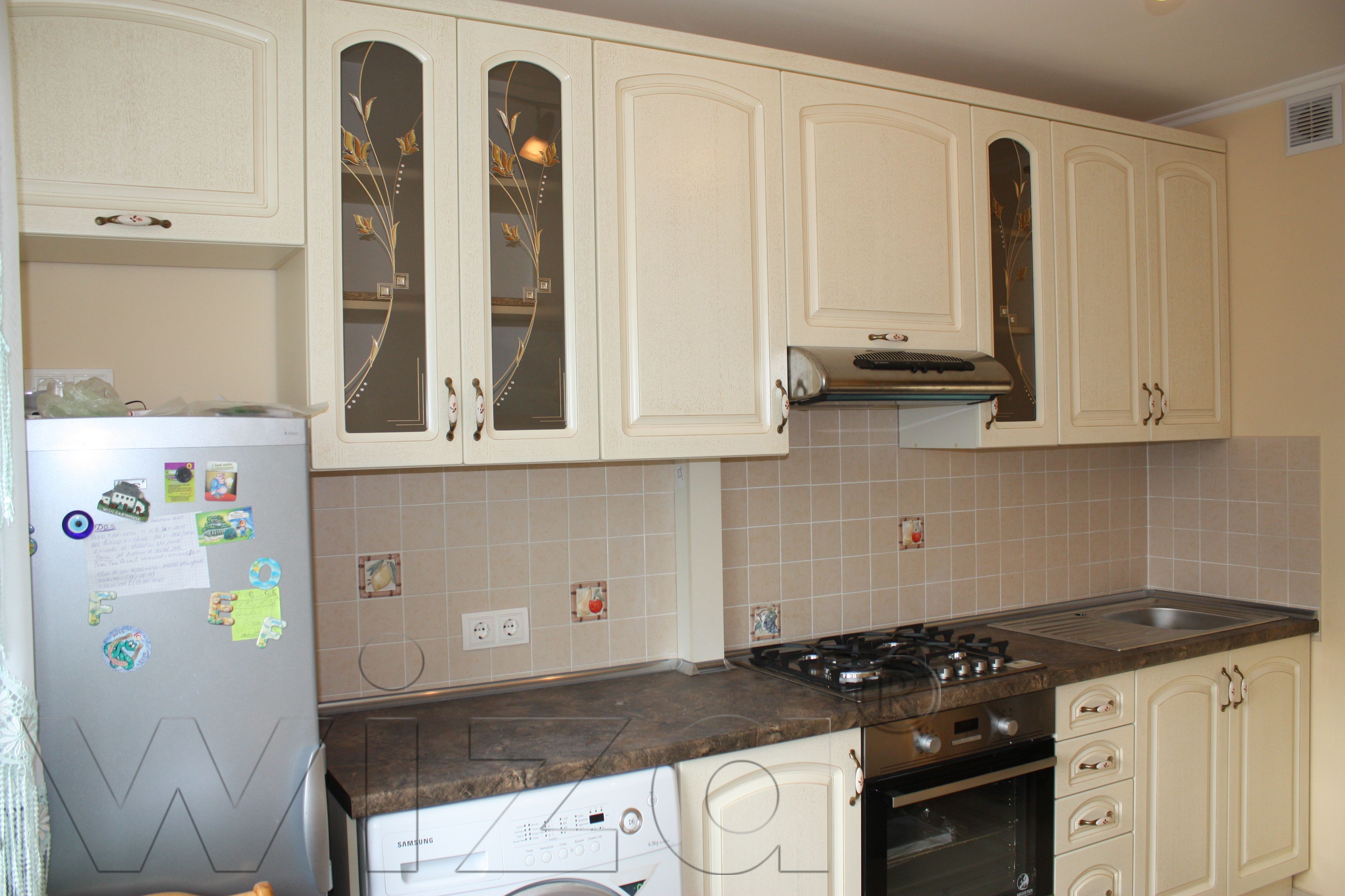 • Сочитание двух материалов:шпона и краски,делает кухню практичной и яркой.