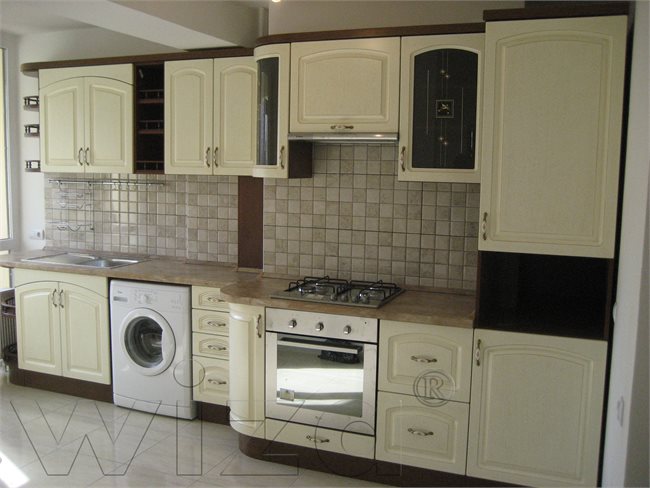 • Сочитание двух материалов:шпона и краски,делает кухню практичной и яркой.