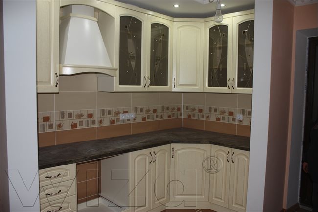 • Сочитание двух материалов:шпона и краски,делает кухню практичной и яркой.