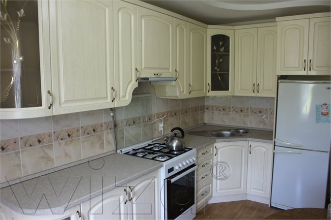 • Сочитание двух материалов:шпона и краски,делает кухню практичной и яркой.