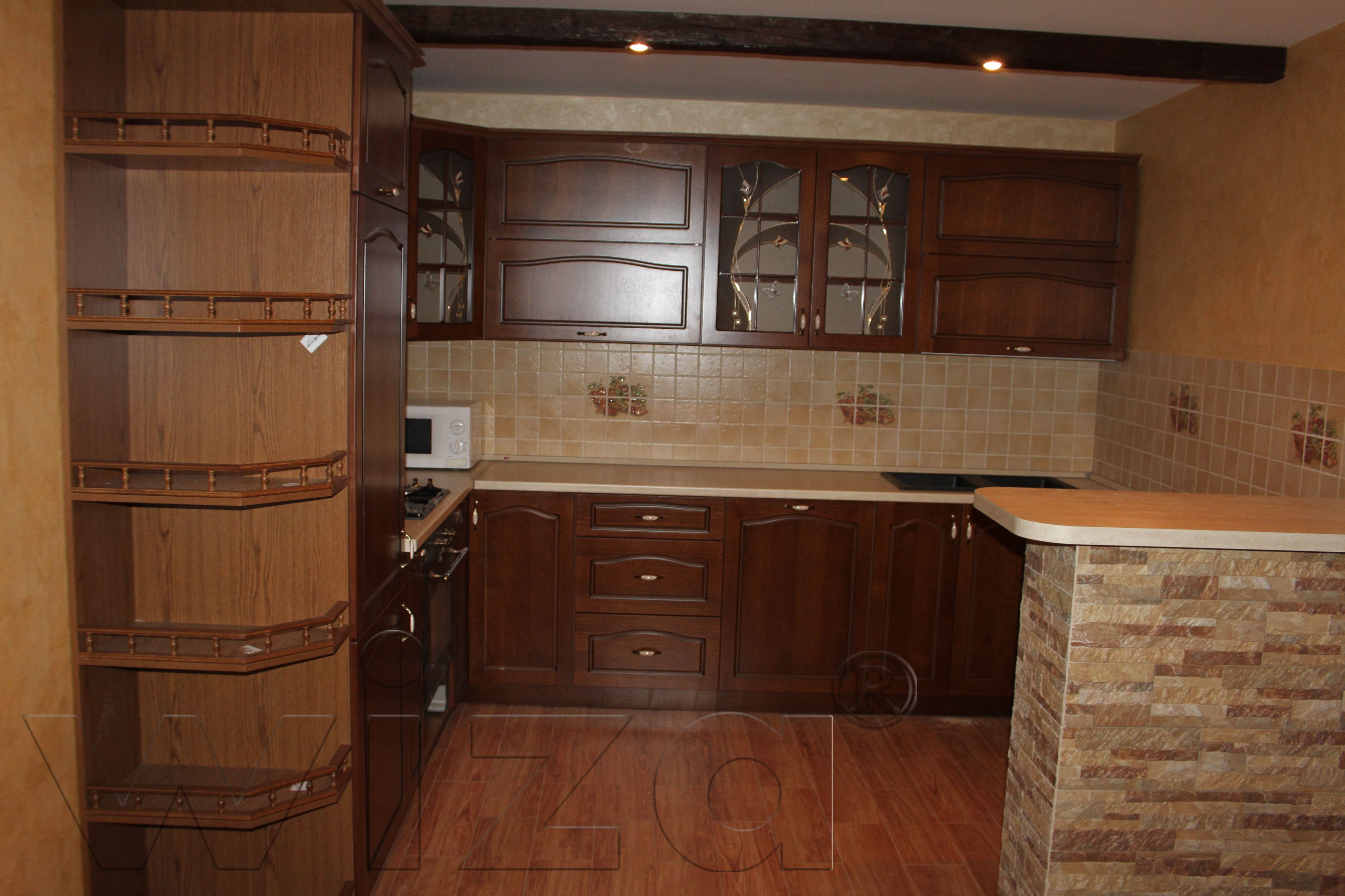 • Сочитание двух материалов:шпона и краски,делает кухню практичной и яркой.