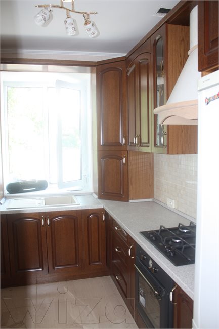 • Сочитание двух материалов:шпона и краски,делает кухню практичной и яркой.