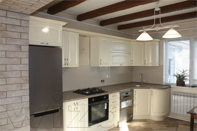 • Сочитание двух материалов:шпона и краски,делает кухню практичной и яркой.
