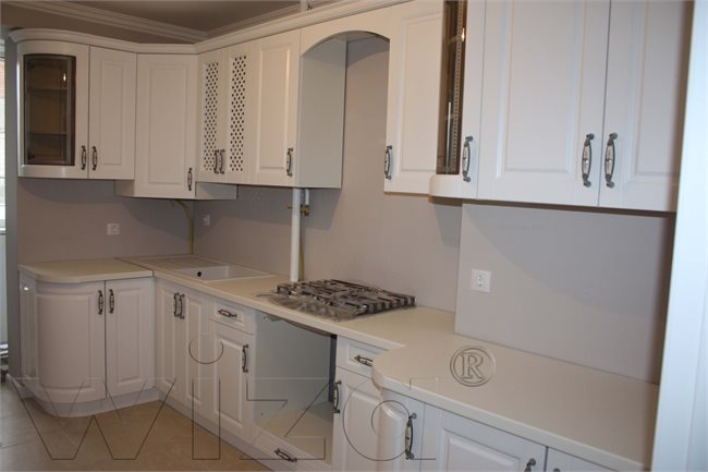 • Сочитание двух материалов:шпона и краски,делает кухню практичной и яркой.