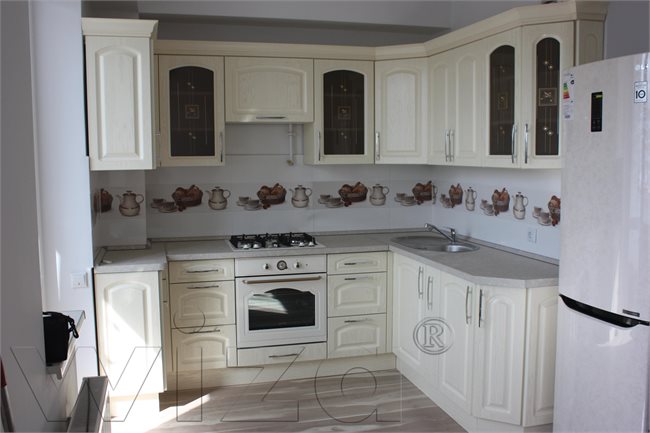• Сочитание двух материалов:шпона и краски,делает кухню практичной и яркой.