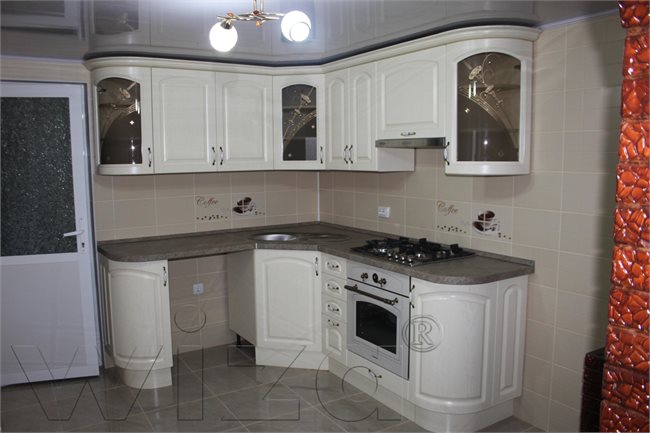 • Сочитание двух материалов:шпона и краски,делает кухню практичной и яркой.
