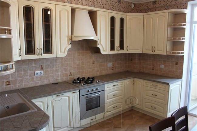 • Сочитание двух материалов:шпона и краски,делает кухню практичной и яркой.