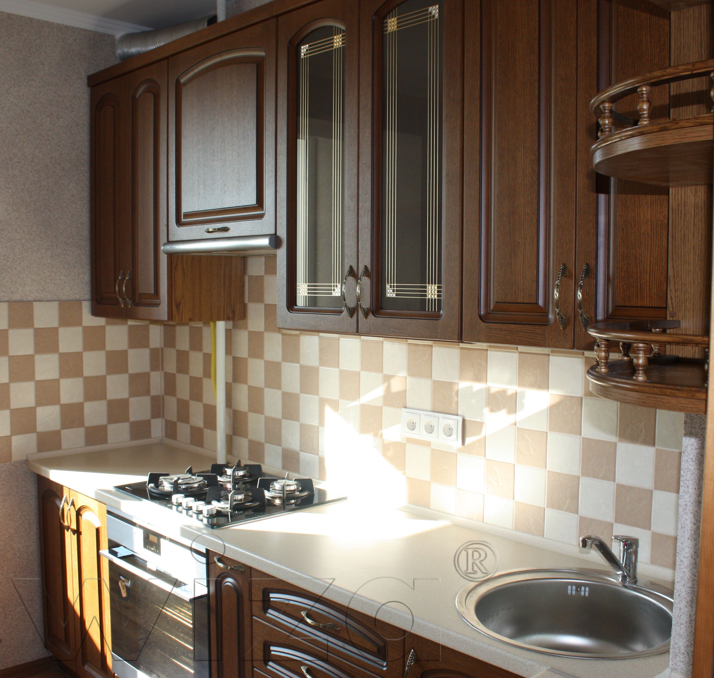 • Сочитание двух материалов:шпона и краски,делает кухню практичной и яркой.