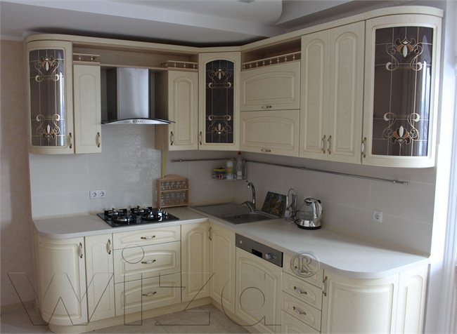 • Сочитание двух материалов:шпона и краски,делает кухню практичной и яркой.