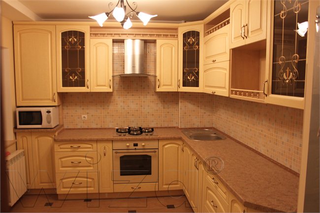 • Сочитание двух материалов:шпона и краски,делает кухню практичной и яркой.