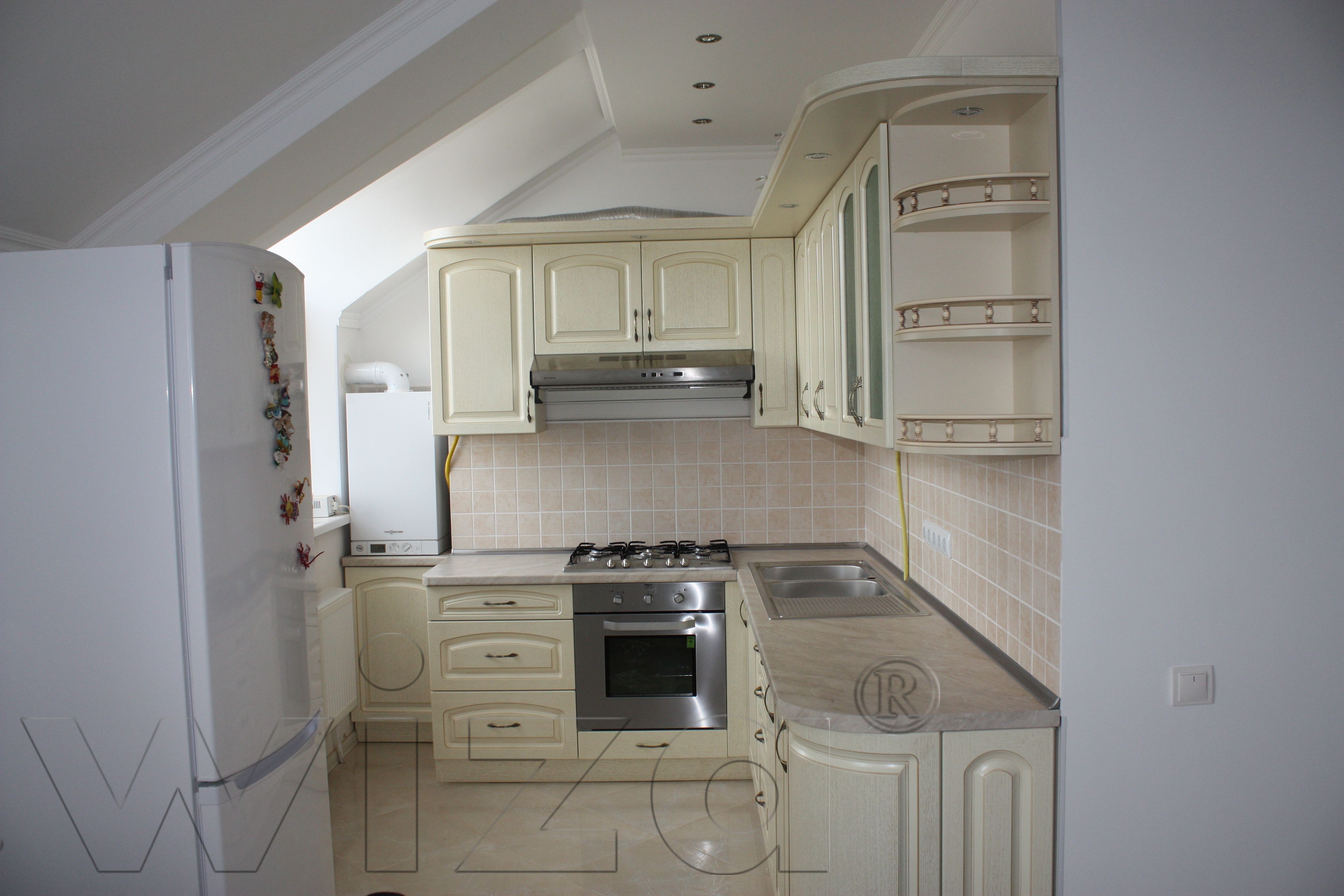 • Сочитание двух материалов:шпона и краски,делает кухню практичной и яркой.