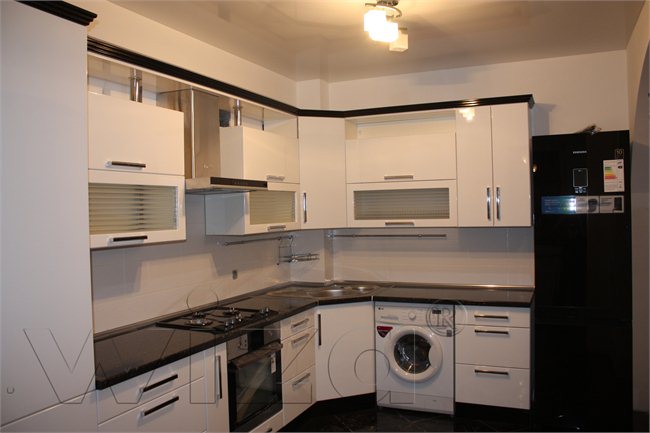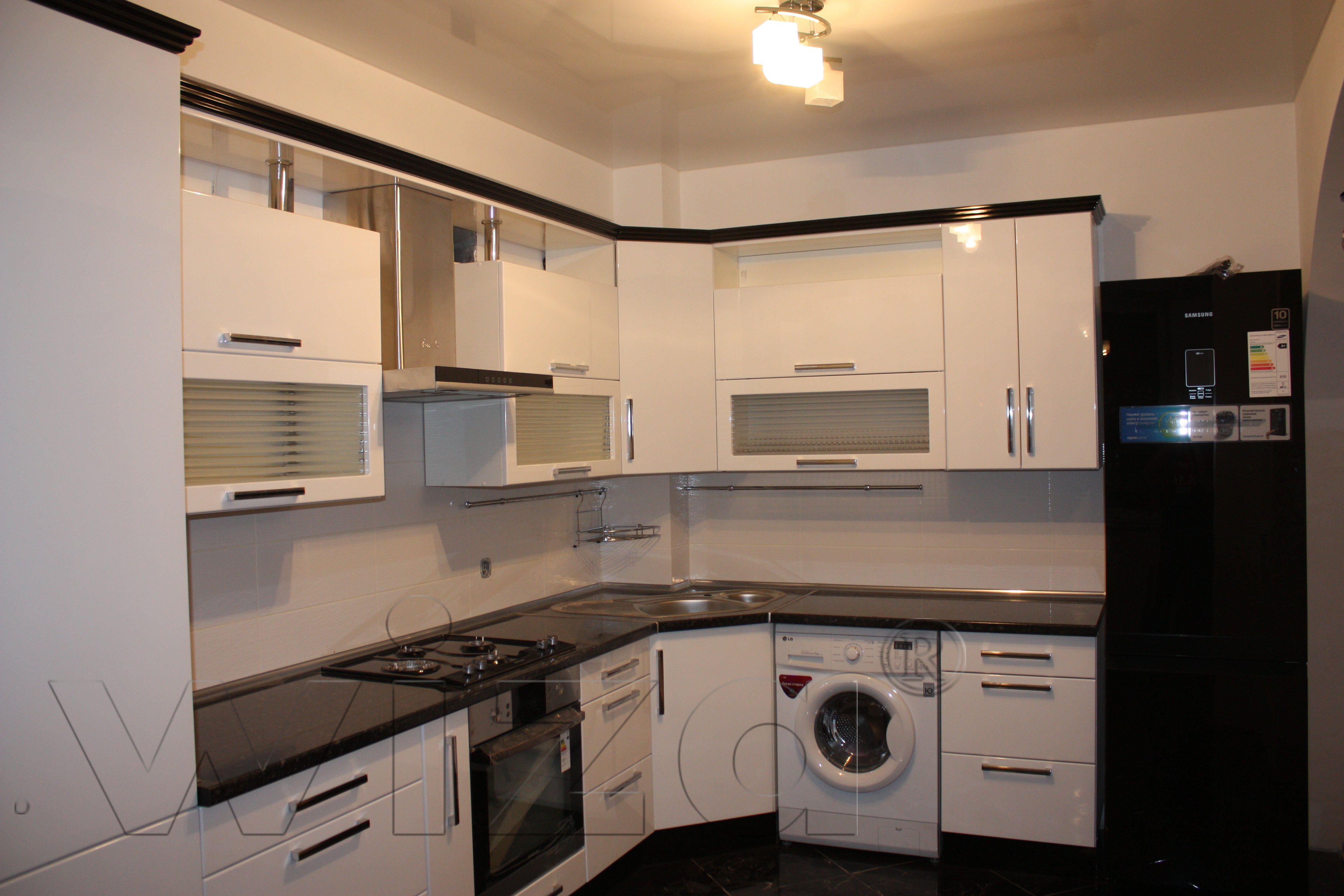 • Стильная линейная кухня очень эргономична, так как соблюдена очередность: холодильник-мойка-плита.