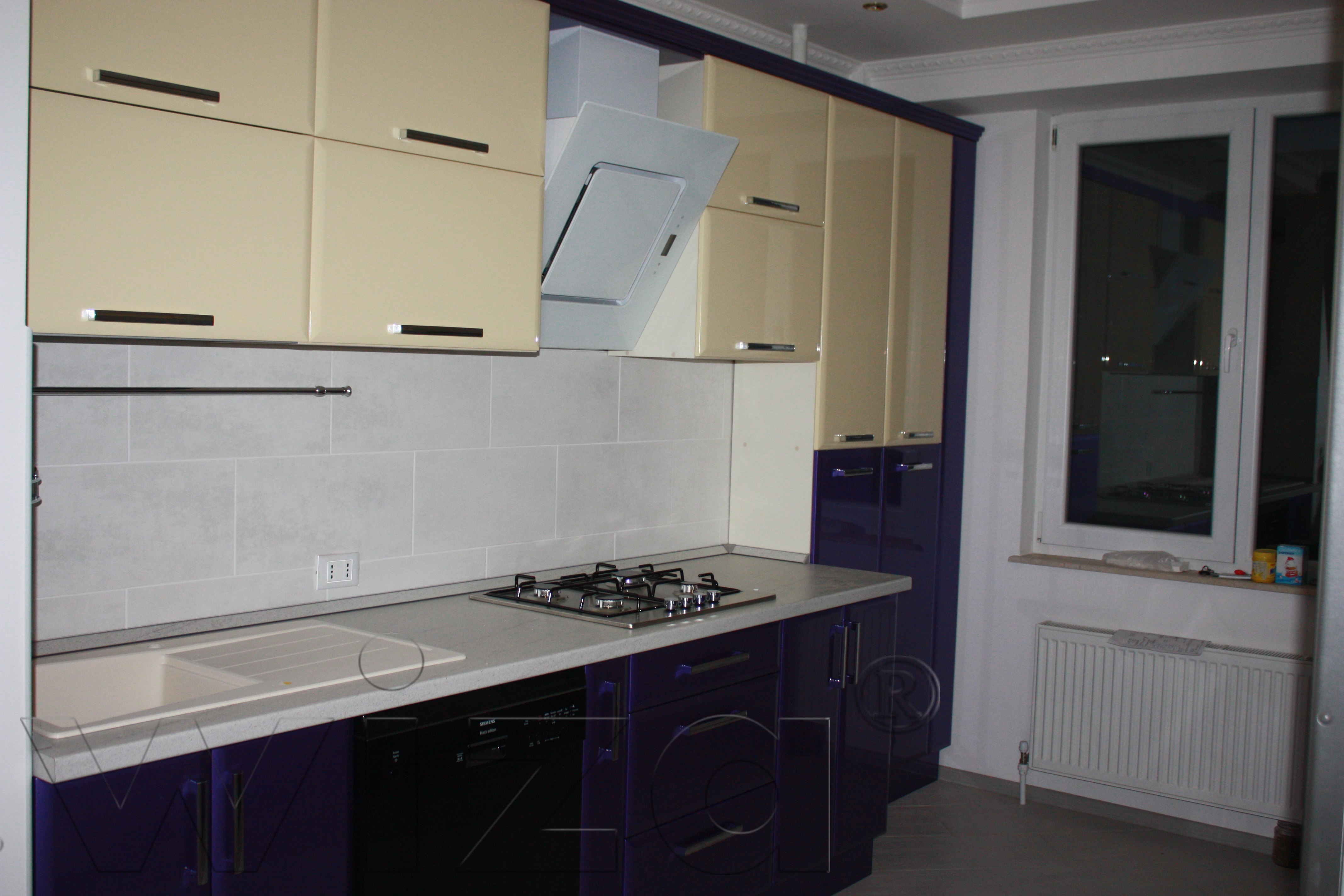 • Стильная линейная кухня очень эргономична, так как соблюдена очередность: холодильник-мойка-плита.