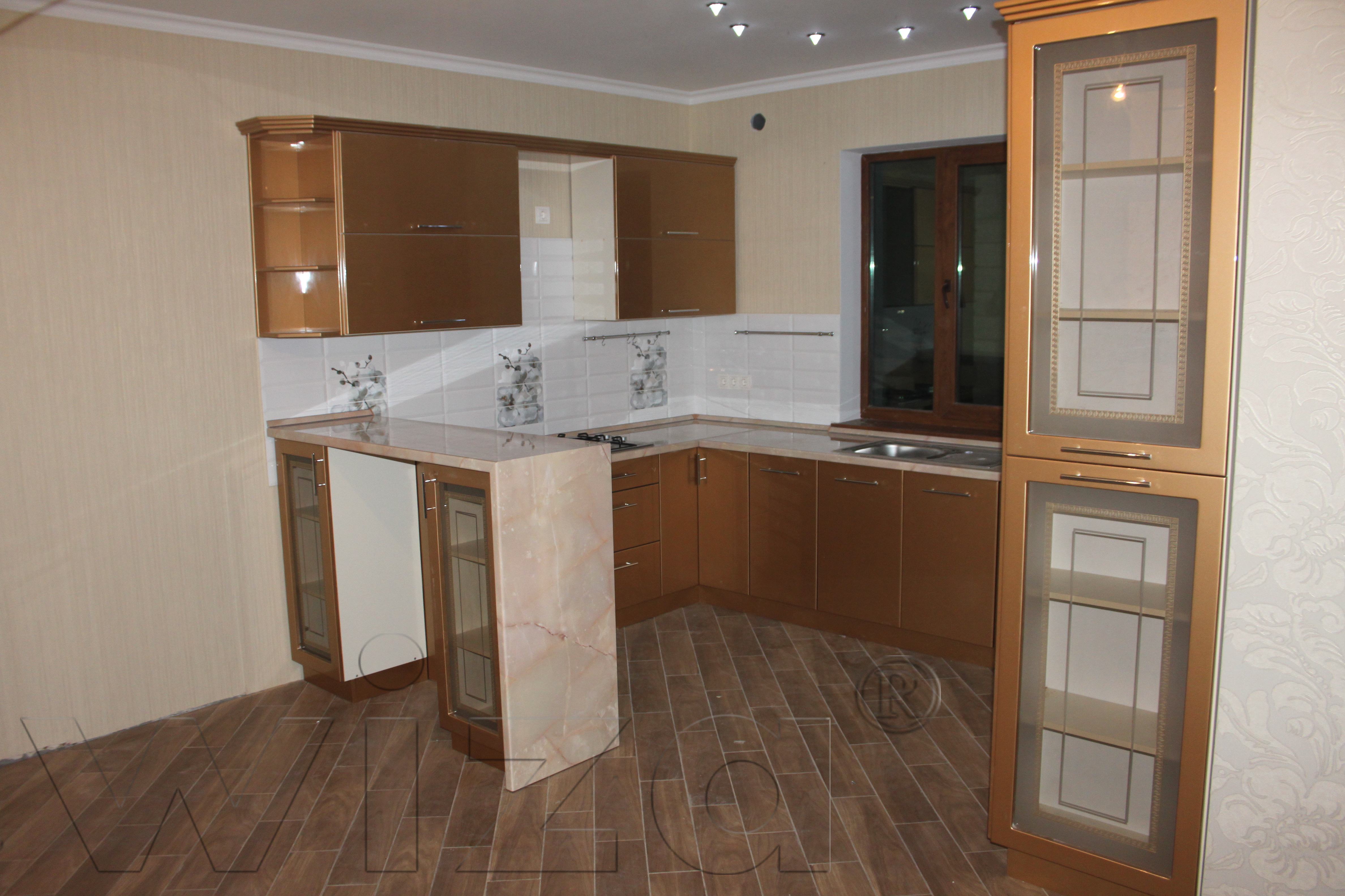 • Сочитание двух материалов:шпона и краски,делает кухню практичной и яркой.