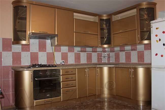 • Сочитание двух материалов:шпона и краски,делает кухню практичной и яркой.