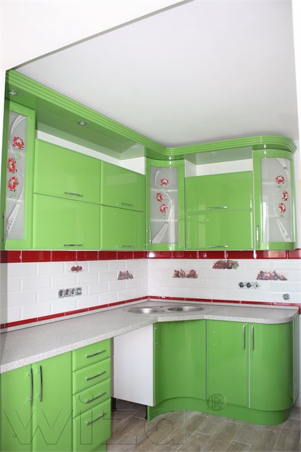• Применение гнутых фасадов придает особую пластичность дизайну кухни.