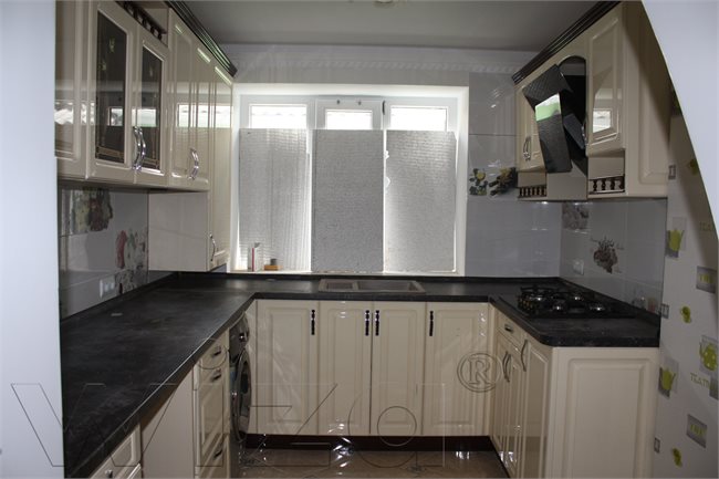 • Сочитание двух материалов:шпона и краски,делает кухню практичной и яркой.