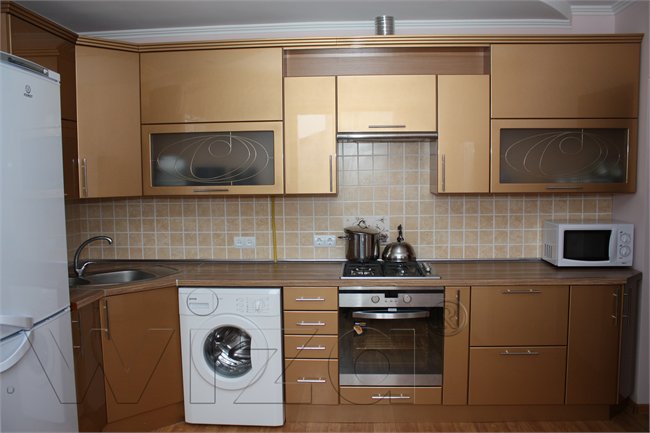 • Стильная линейная кухня очень эргономична, так как соблюдена очередность: холодильник-мойка-плита.