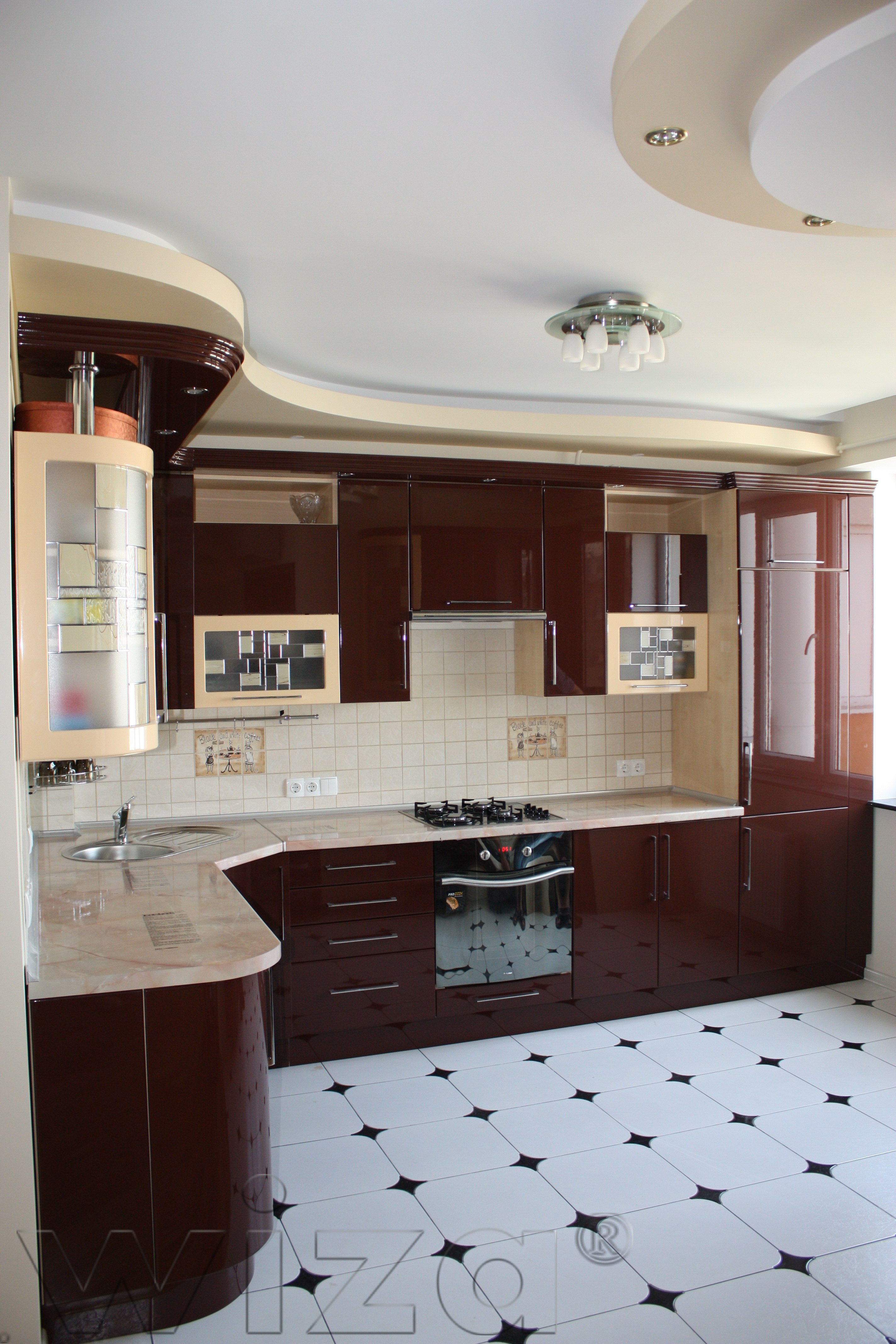 • Роскошная кухня с глянцевыми фасадами глубокого оттенка.
