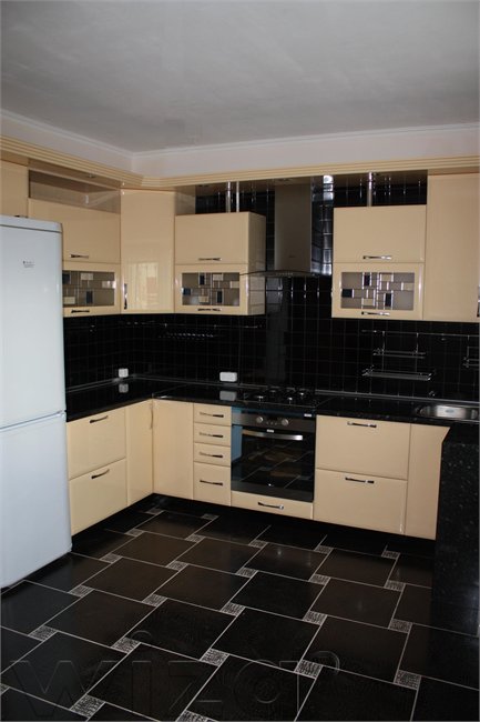 • Стильная линейная кухня очень эргономична, так как соблюдена очередность: холодильник-мойка-плита.