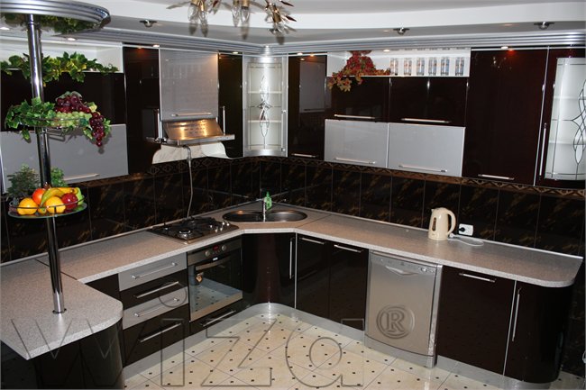 • Применение гнутых фасадов придает особую пластичность дизайну кухни.