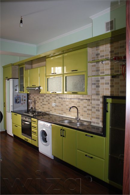 • Сочитание двух материалов:шпона и краски,делает кухню практичной и яркой.