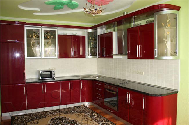 • Глянцевый блеск крашеной кухни делает помещение светлее.