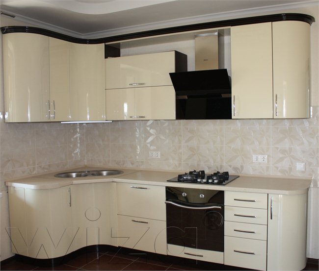 • Применение гнутых фасадов придает особую пластичность дизайну кухни.