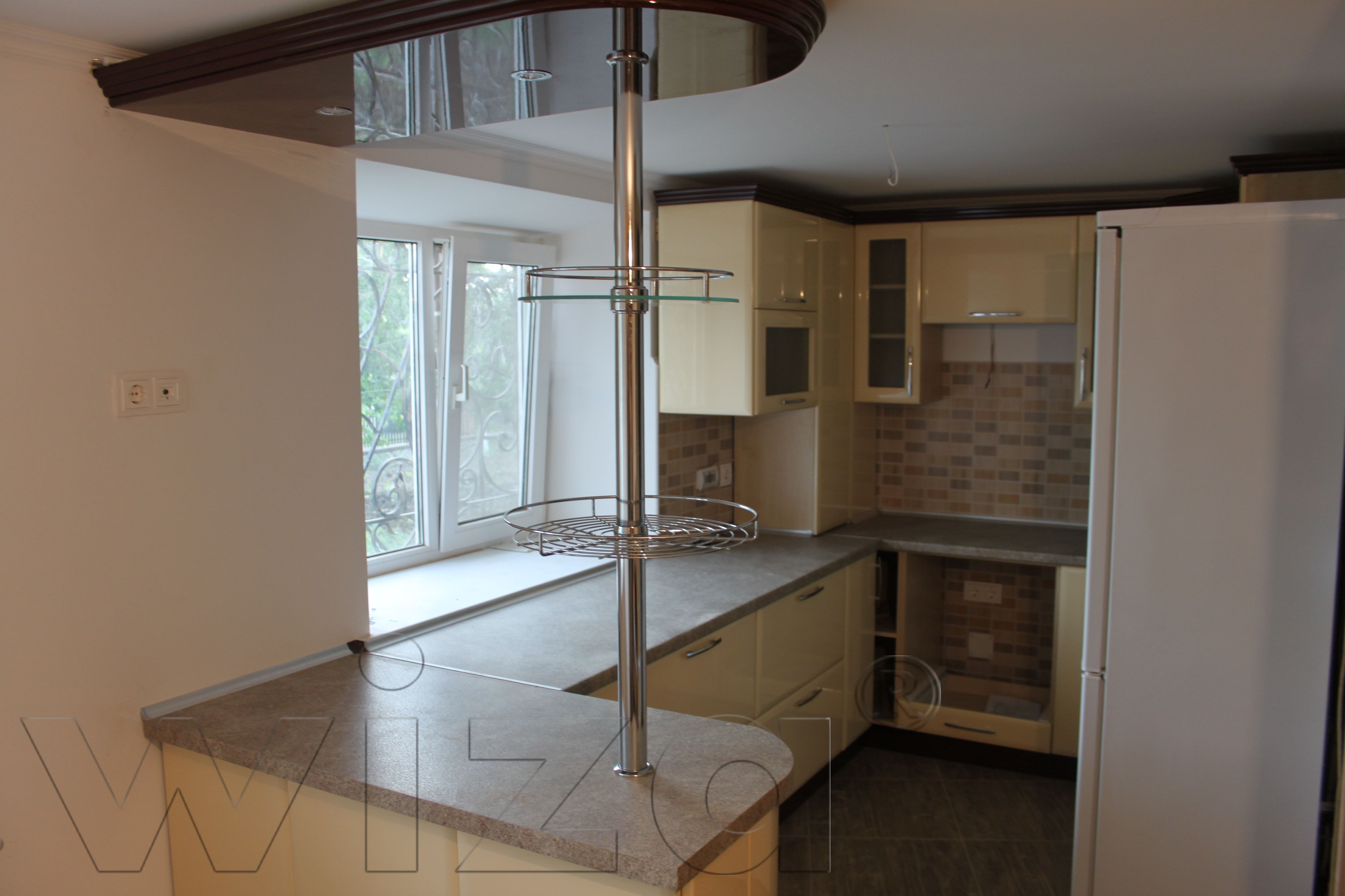 • Распространенное дизайнерское решение — небольшая кухня и барная стойка на месте бывшего подоконника.
