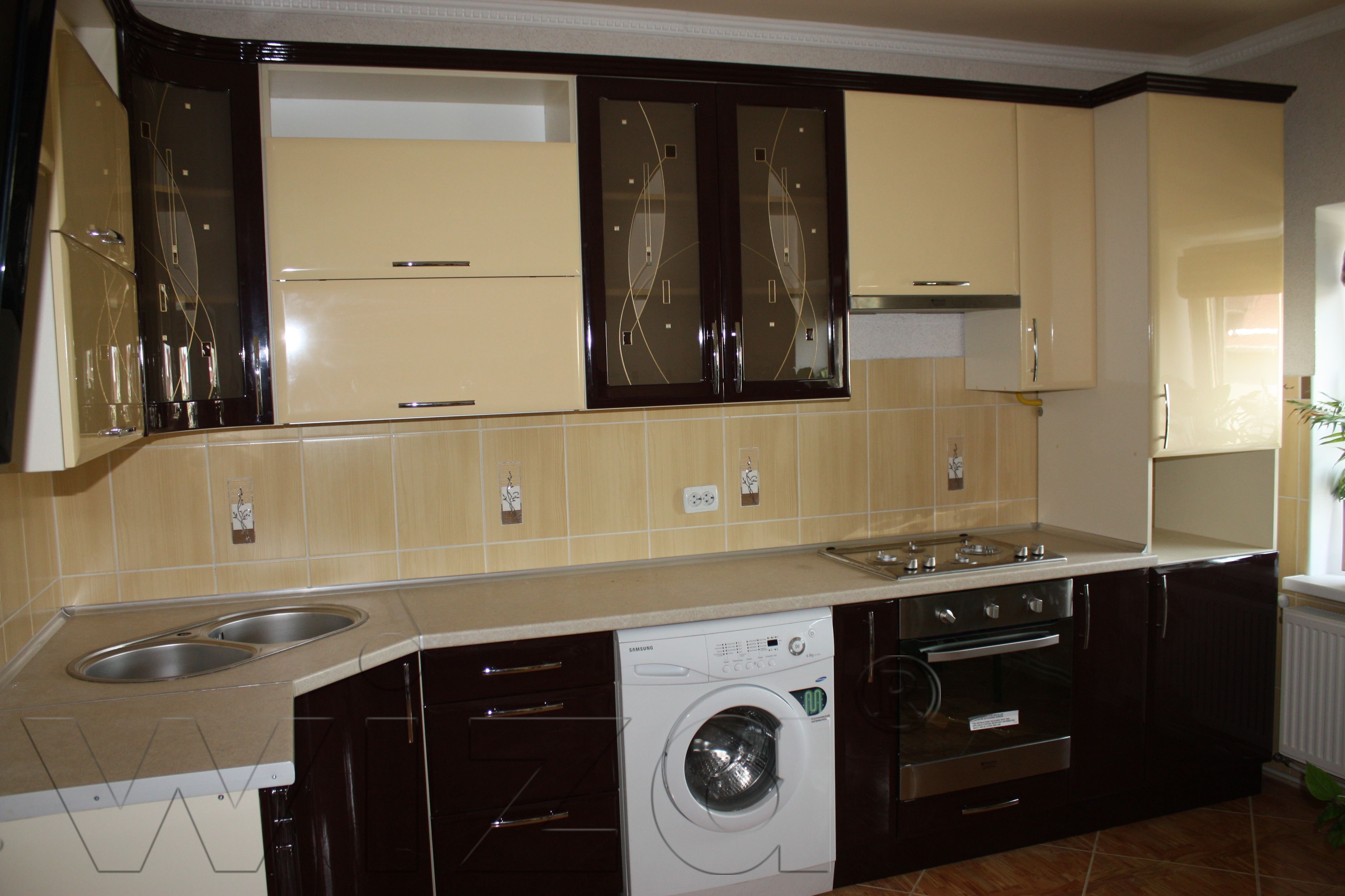 • Сочитание двух материалов:шпона и краски,делает кухню практичной и яркой.