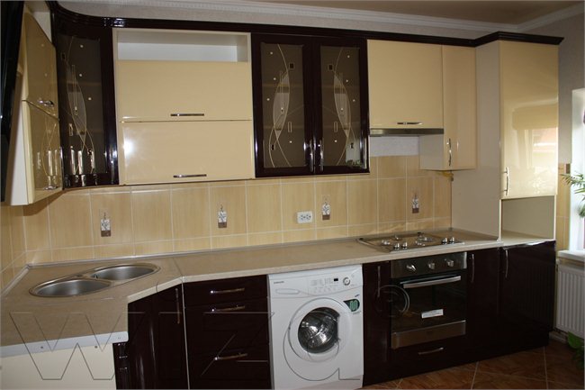 • Стильная линейная кухня очень эргономична, так как соблюдена очередность: холодильник-мойка-плита.