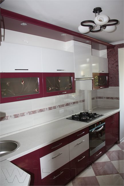 • Имитация красного дерева в сочетании с фрезой и керамическими ручками придает кухне дорогостоящий вид.
