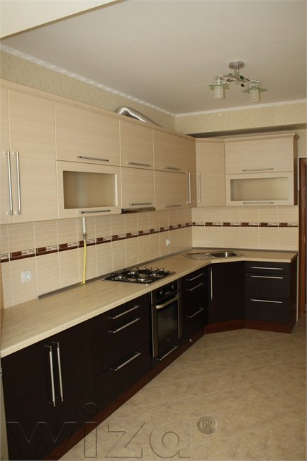 • Приятная кухня теплого, песочного оттенка, нижний ярус которой изготовлен с фасадами цвета шоколада.