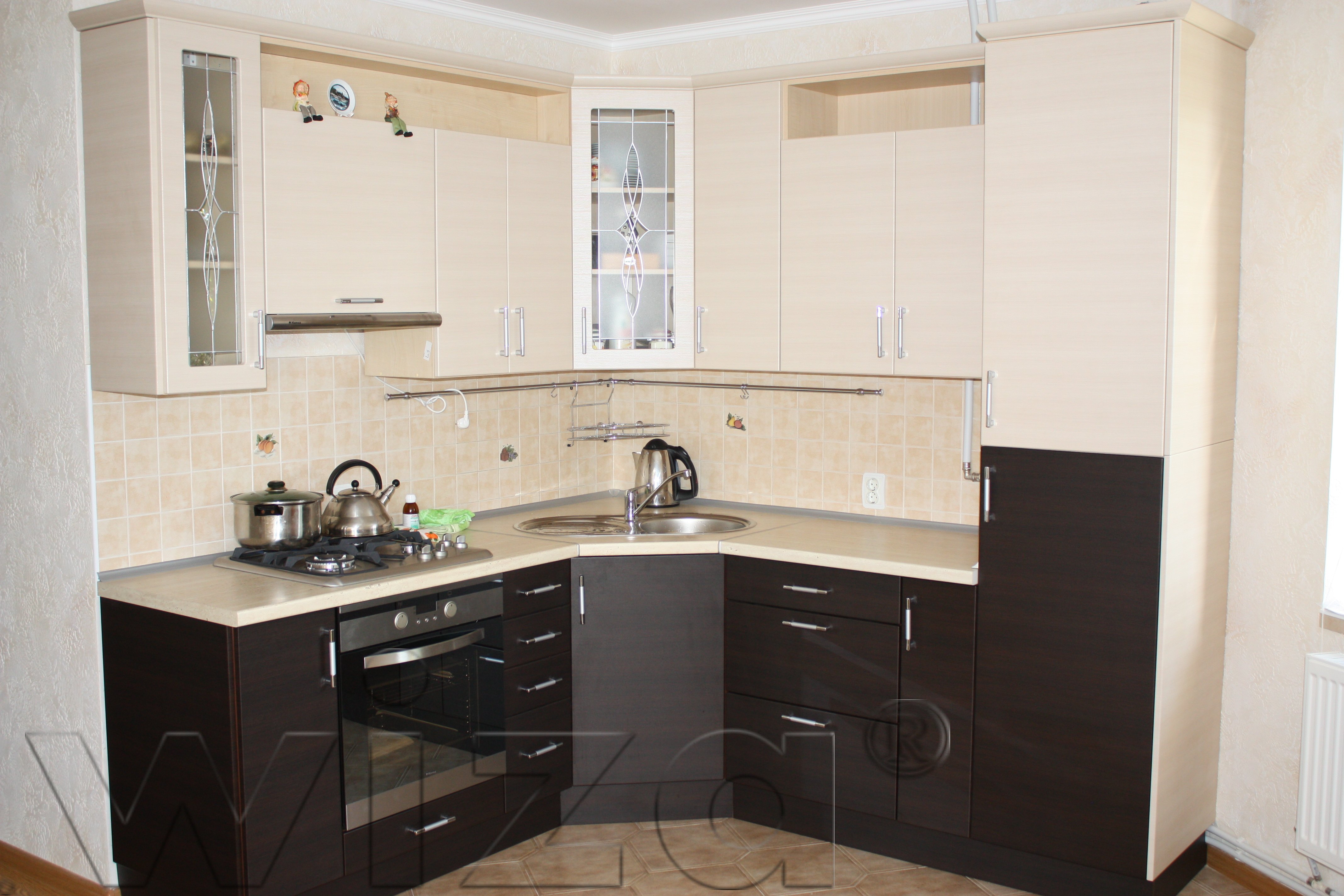 Угловая мойка позволяет экономить рабочее пространство на маленькой кухне.