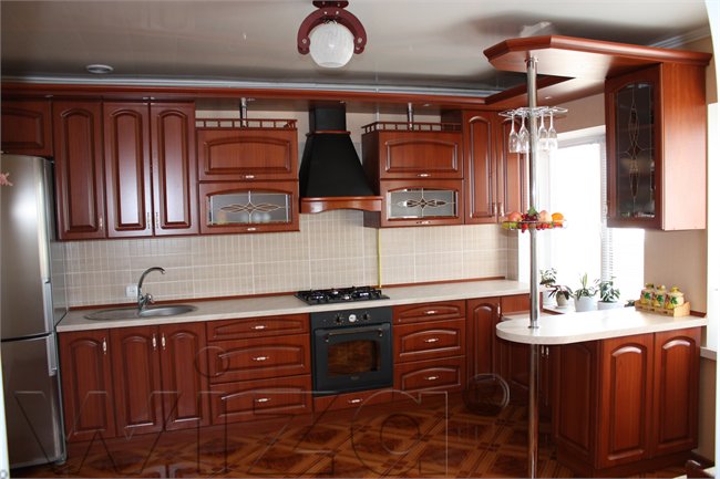 Имитация красного дерева в сочетании с фрезой и керамическими ручками придает кухне дорогостоящий вид.