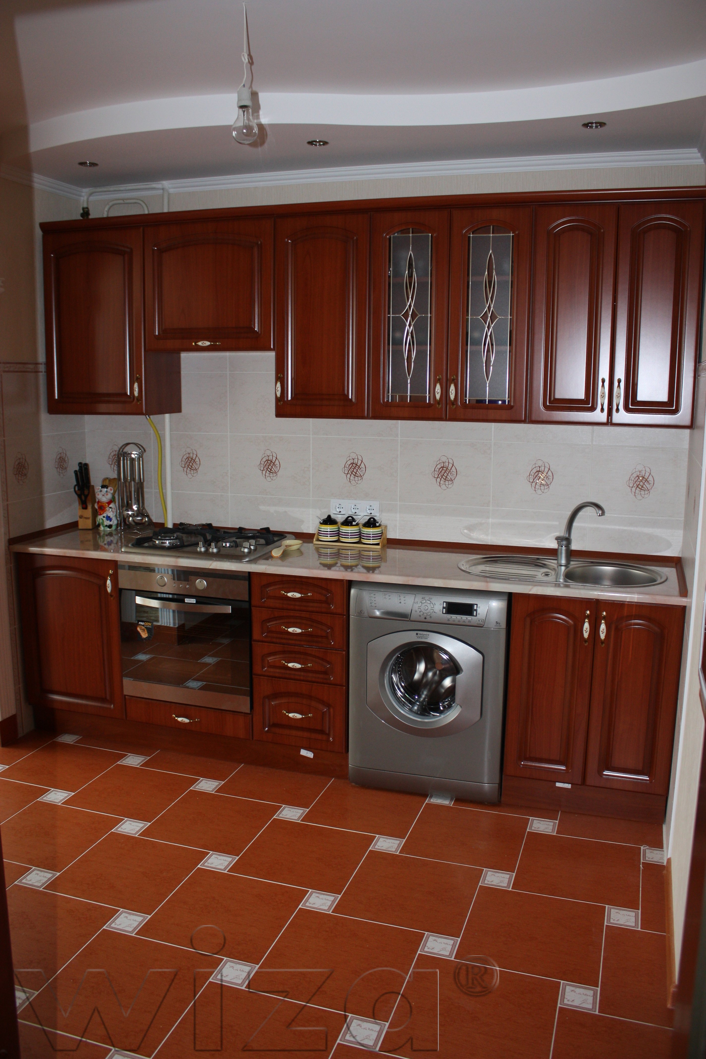 • Имитация красного дерева в сочетании с фрезой и керамическими ручками придает кухне дорогостоящий вид.
