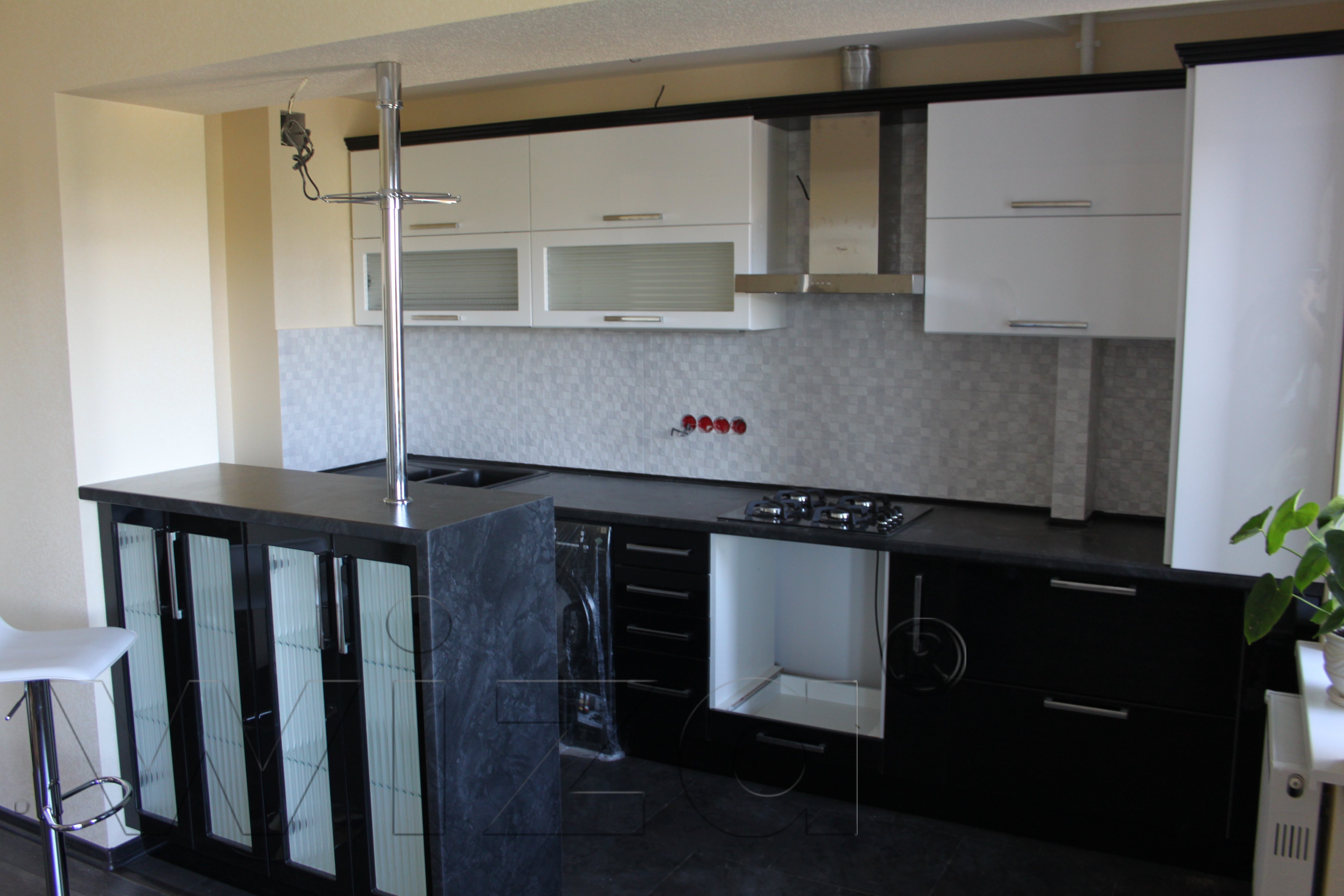 • Солидная кухня с необычной, двухэтажной барной стойкой.