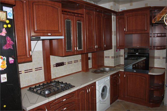 • Эта модель кухни отличается цветом, имитацией красного дерева.