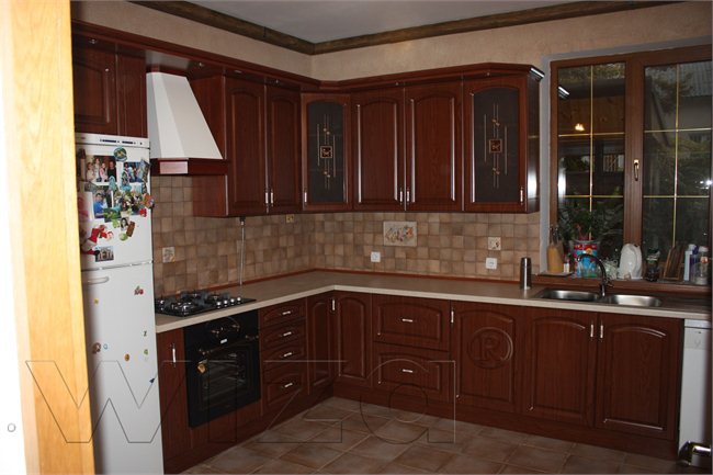 • Эта модель кухни отличается цветом, имитацией красного дерева.