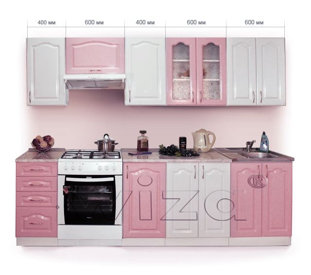 Кухня, с ламинированными фасадами глянцевой пленкой PVC, белого и розового цвета