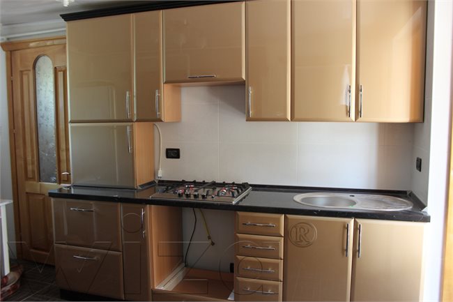 • Сочитание двух материалов:шпона и краски,делает кухню практичной и яркой.