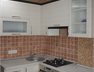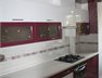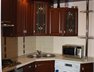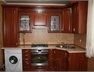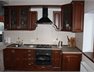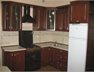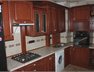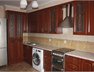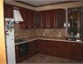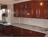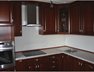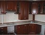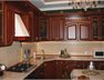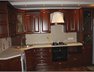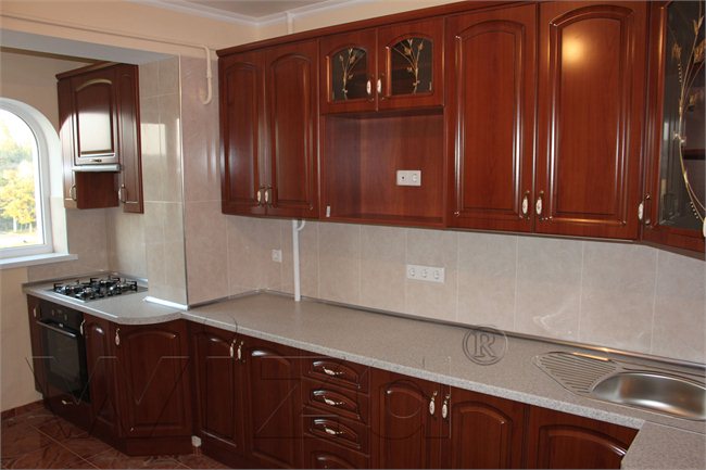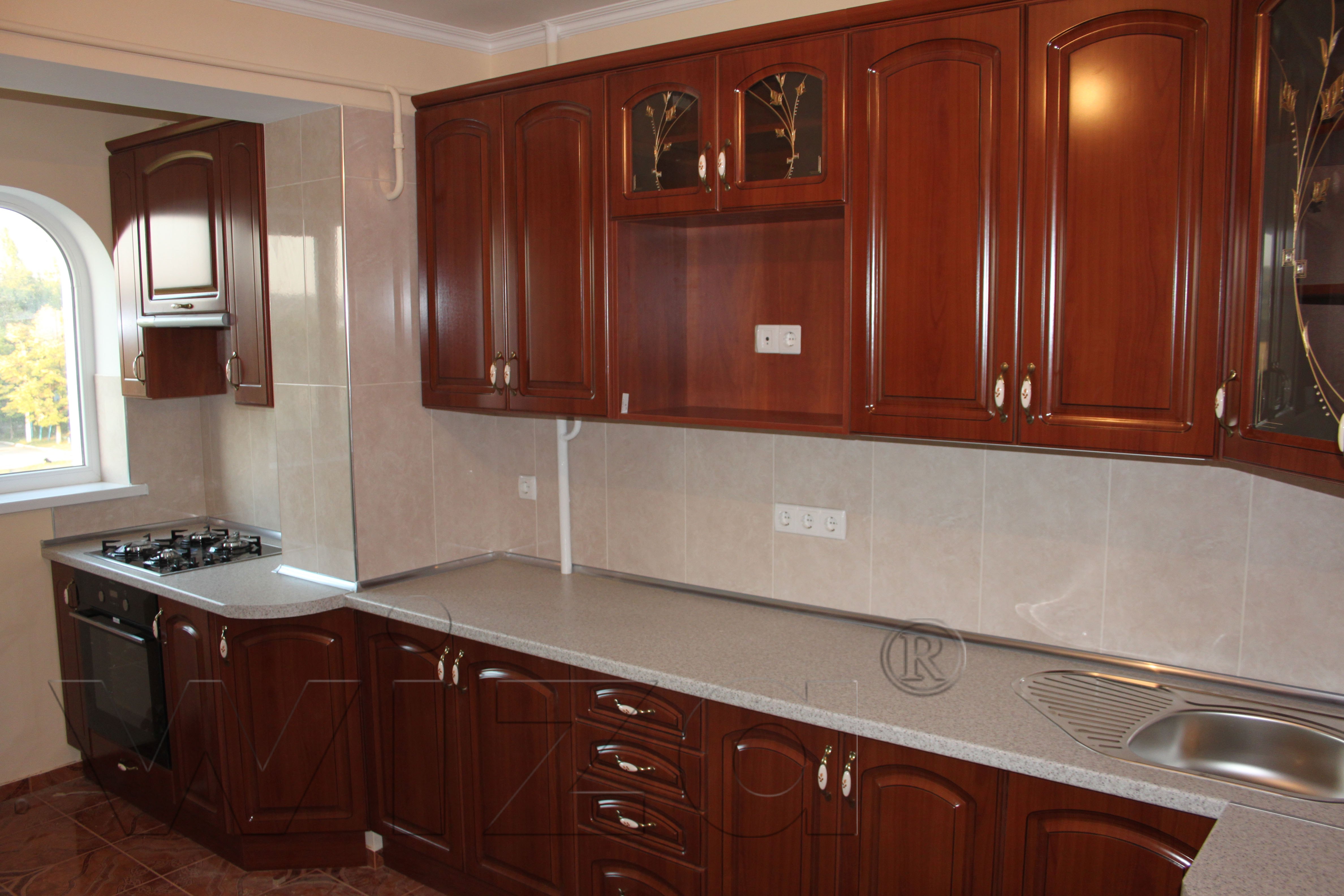 • Имитация красного дерева в сочетании с фрезой и керамическими ручками придает кухне дорогостоящий вид.
