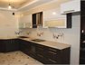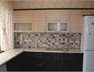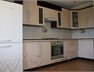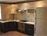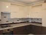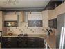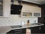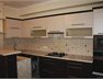 • Приятная кухня теплого, песочного оттенка, нижний ярус которой изготовлен с фасадами цвета шоколада.
