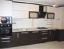 • Стиль этой кухни — минимализм — отражается и в формах, и в цвете и в фурнитуре кухни.